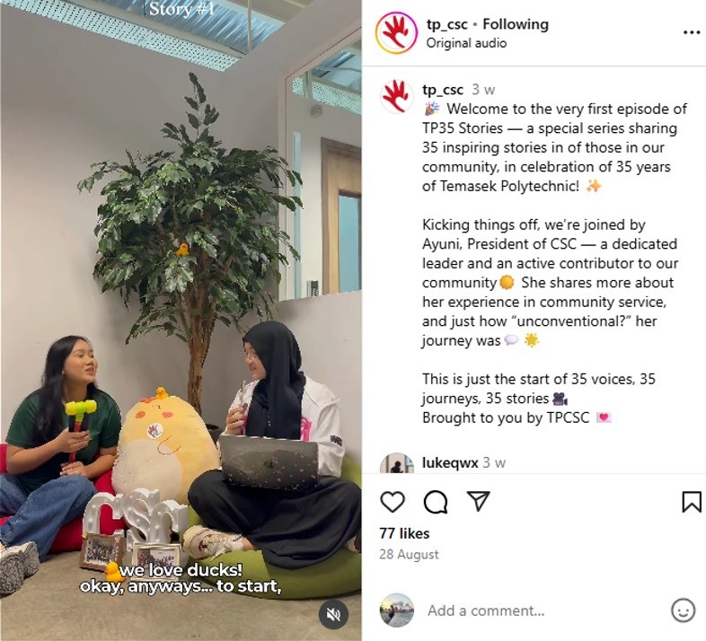 ![]() Welcome to Episode 1 of this special series, sharing 35 inspiring stories of those in our community, in celebration of 35 years of Temasek Polytechnic! This episode features Ayuni, President of TPCSC — a dedicated student leader and an active contributor to our community. |